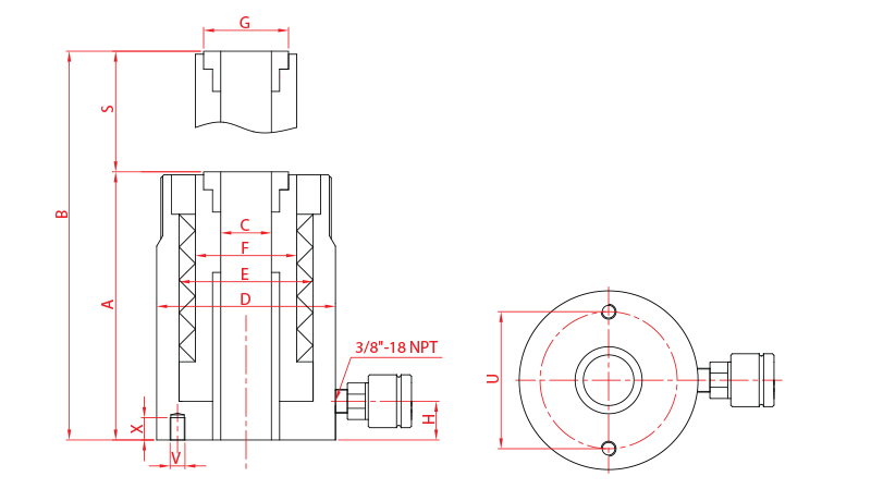 | Model | Kapasite | Stroke | Delik Çapı | Etki Alanı | Yağ Hacmi | Kapalı Boy | Dış Çap | Ağırlık | E | F | G | H | U | V | X |