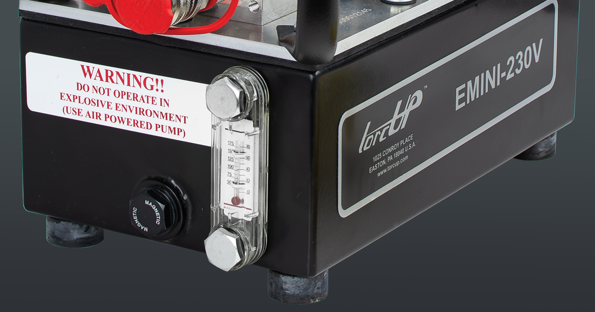 Alüminyum yağ tankı en zorlu ortamlarda çalışmak için hafif ve oldukça dayanıklıdır. TorcUP EMINI hidrolik tork anahtarı pompaları standart olarak 5,3 litre kapasiteli tank ile sunulur. Tank üzerinde yağ seviyesi ve sıcaklık göstergesi vardır. Ayrıca boşaltma tapası mıknatıslıdır, istenmeyen çapakların sisteme girmesi engellenir.