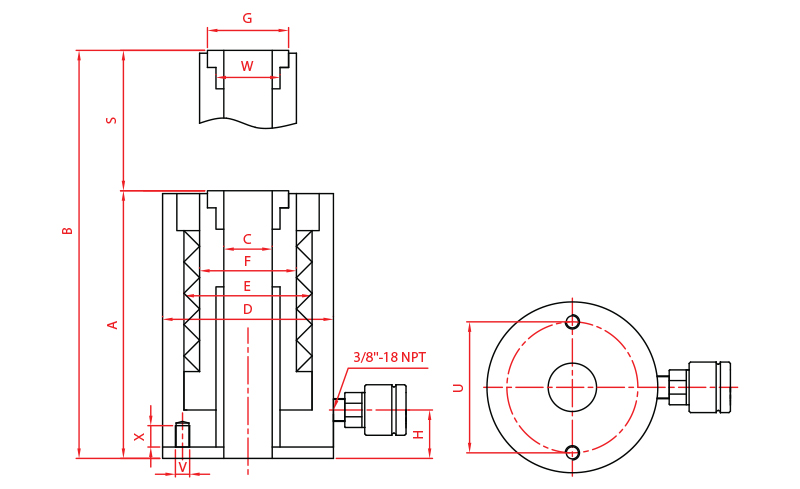 | Model | Kapasite | Stroke | Delik Çapı | Etki Alanı | Yağ Hacmi | Kapalı Boy | Dış Çap | Ağırlık | E | F | G | H | U | V | X |