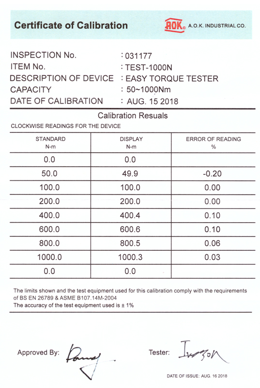 Tork test cihazı fabrikadan In-House kalibrasyon belgesi ile sevk edilir. Her cihaz tek tek kalite kontrolden geçirilir ve BS7882:2008 standartına göre kalibrasyon edilir. Kalibrasyon belgesi sevkiyat içeriğinde yer almaktadır.