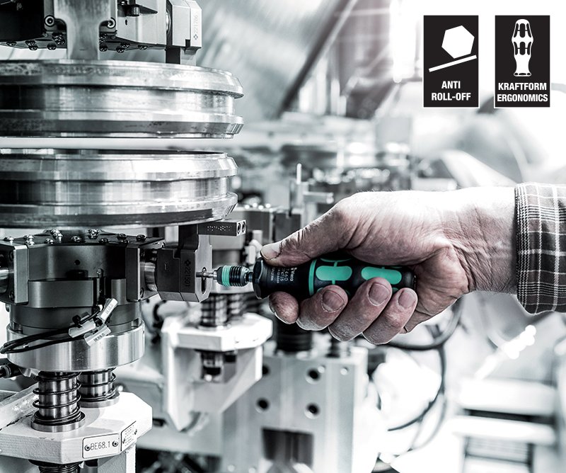 Wera torklu tornavidalar ergonomik ‘Kraftform’ kabza ile sunulur. Ele tam oturan ve kaymayan bu kabza tasarımı yalnızca Wera markaya özeldir. Ayrıca hızlı bits uç değişimi sunan ‘Rapidaptor’ bits tutucu standart olarak Wera marka tork ayarlı tornavidalarda mevcuttur.